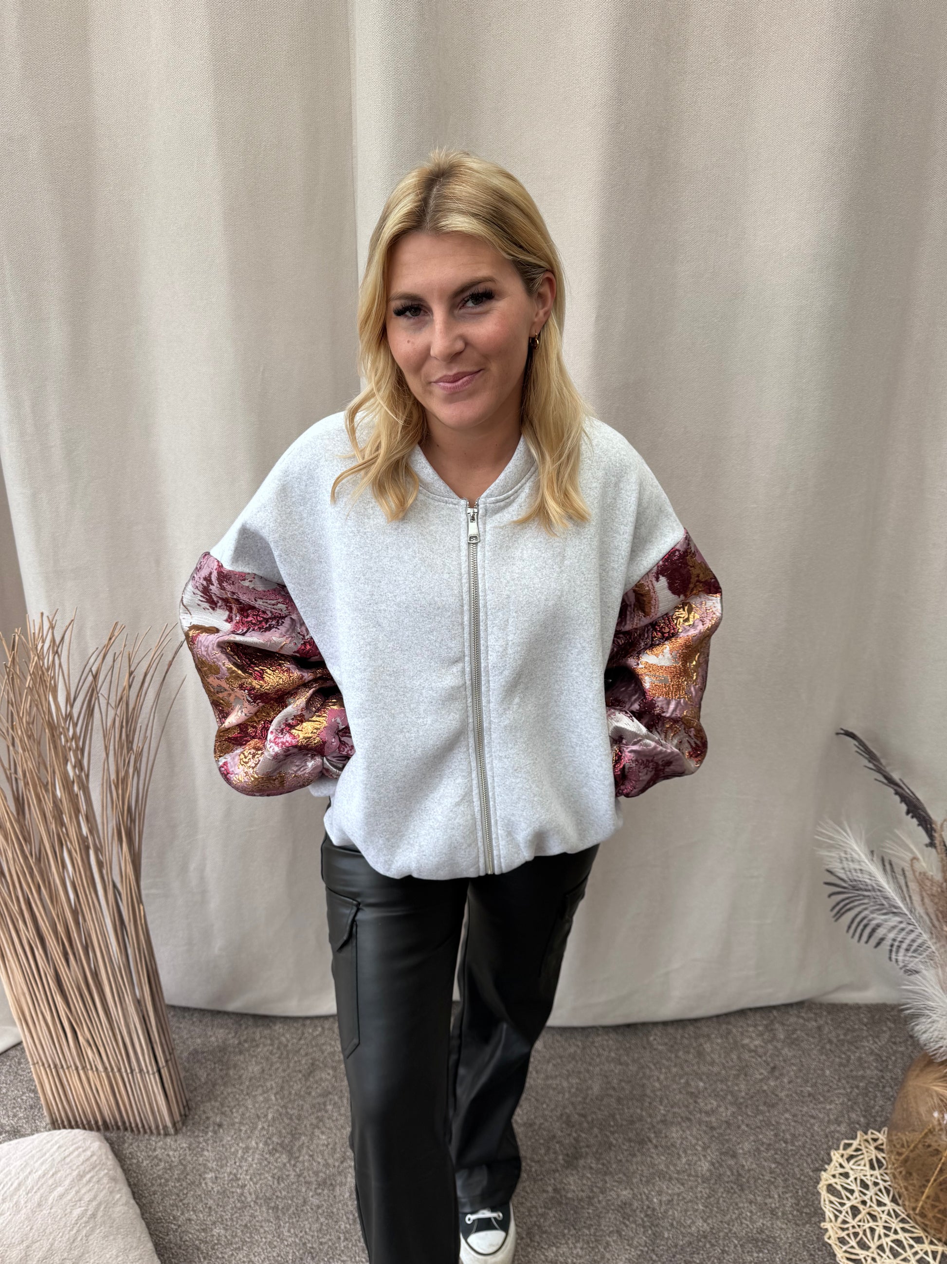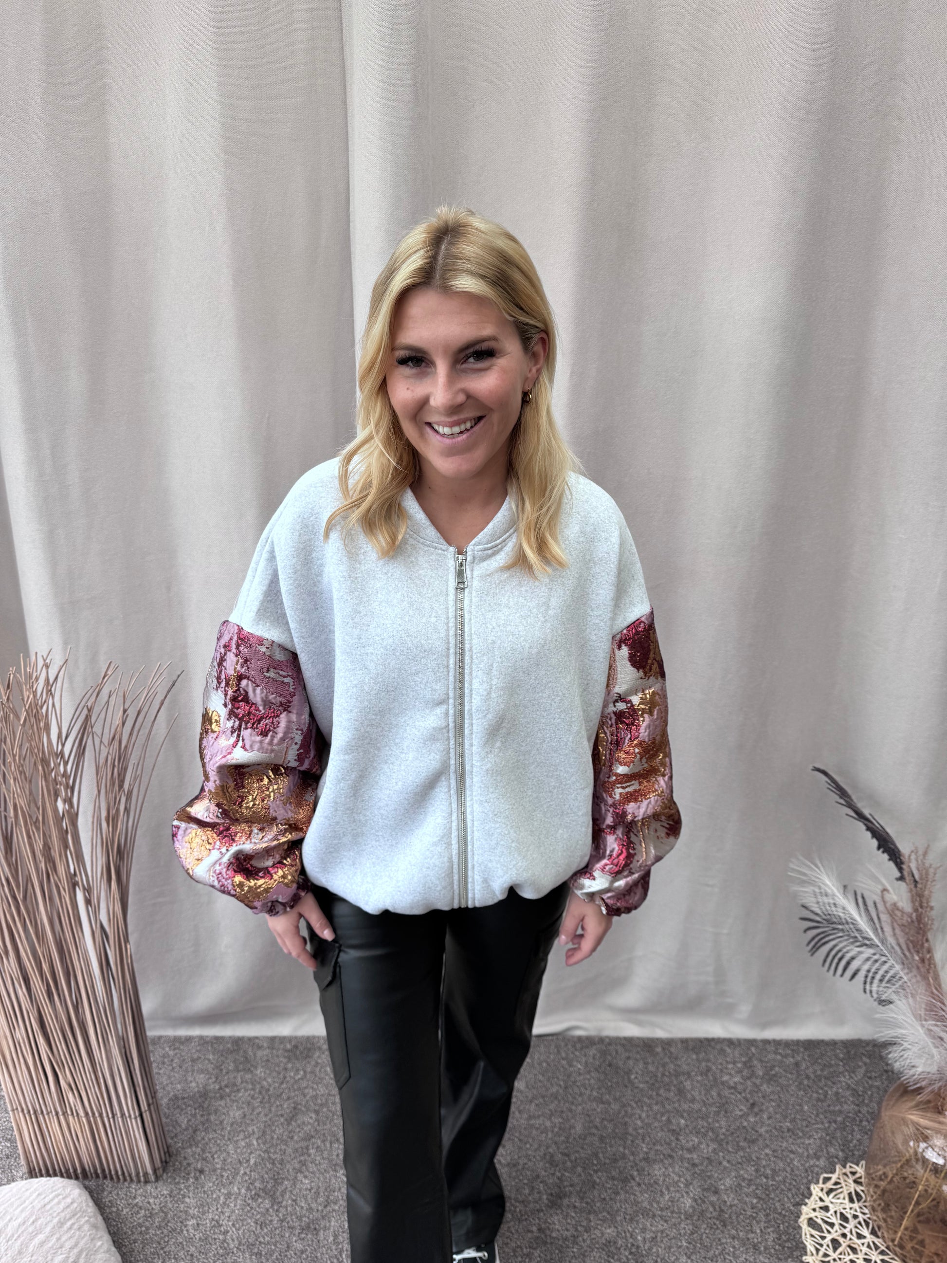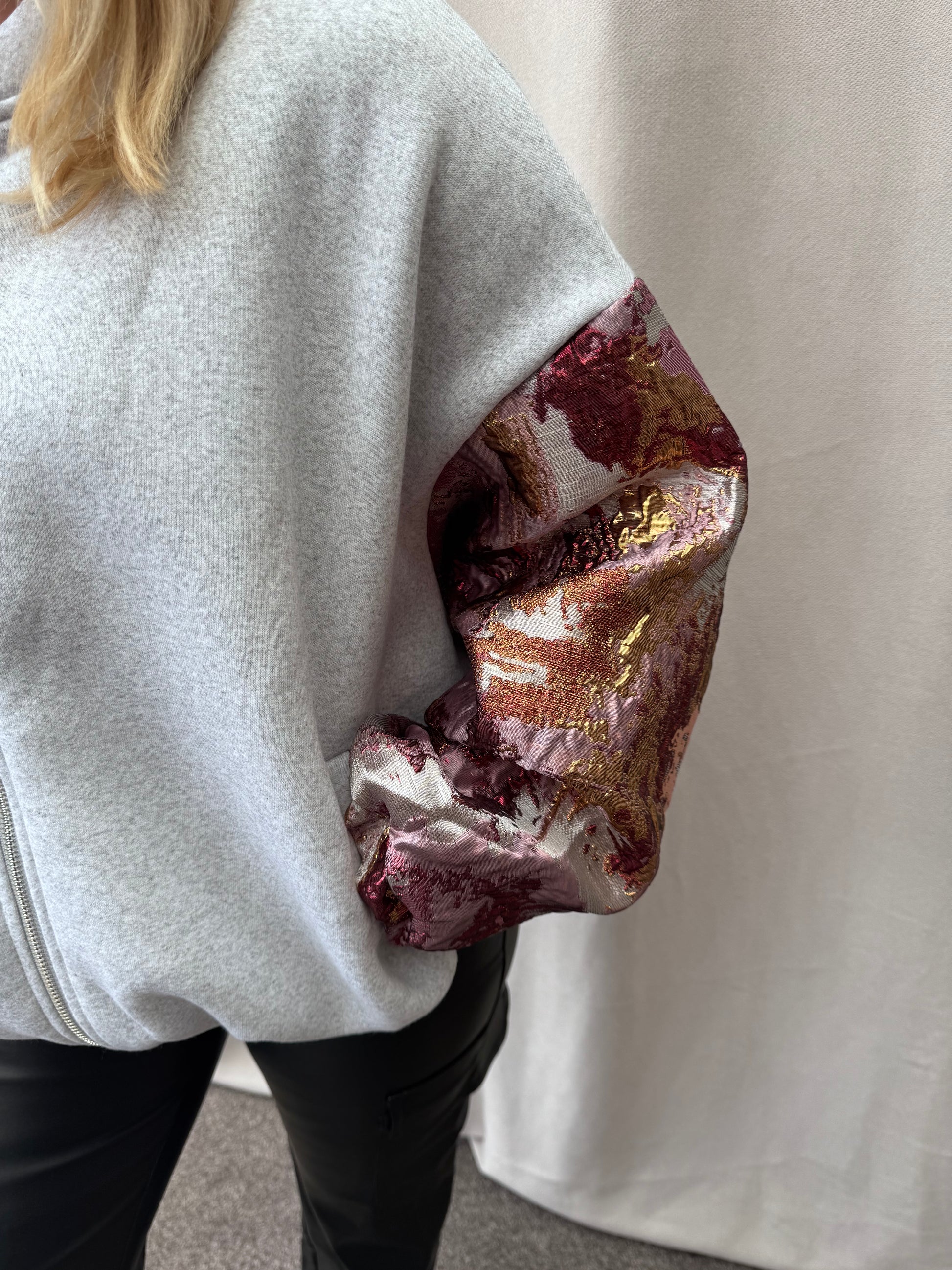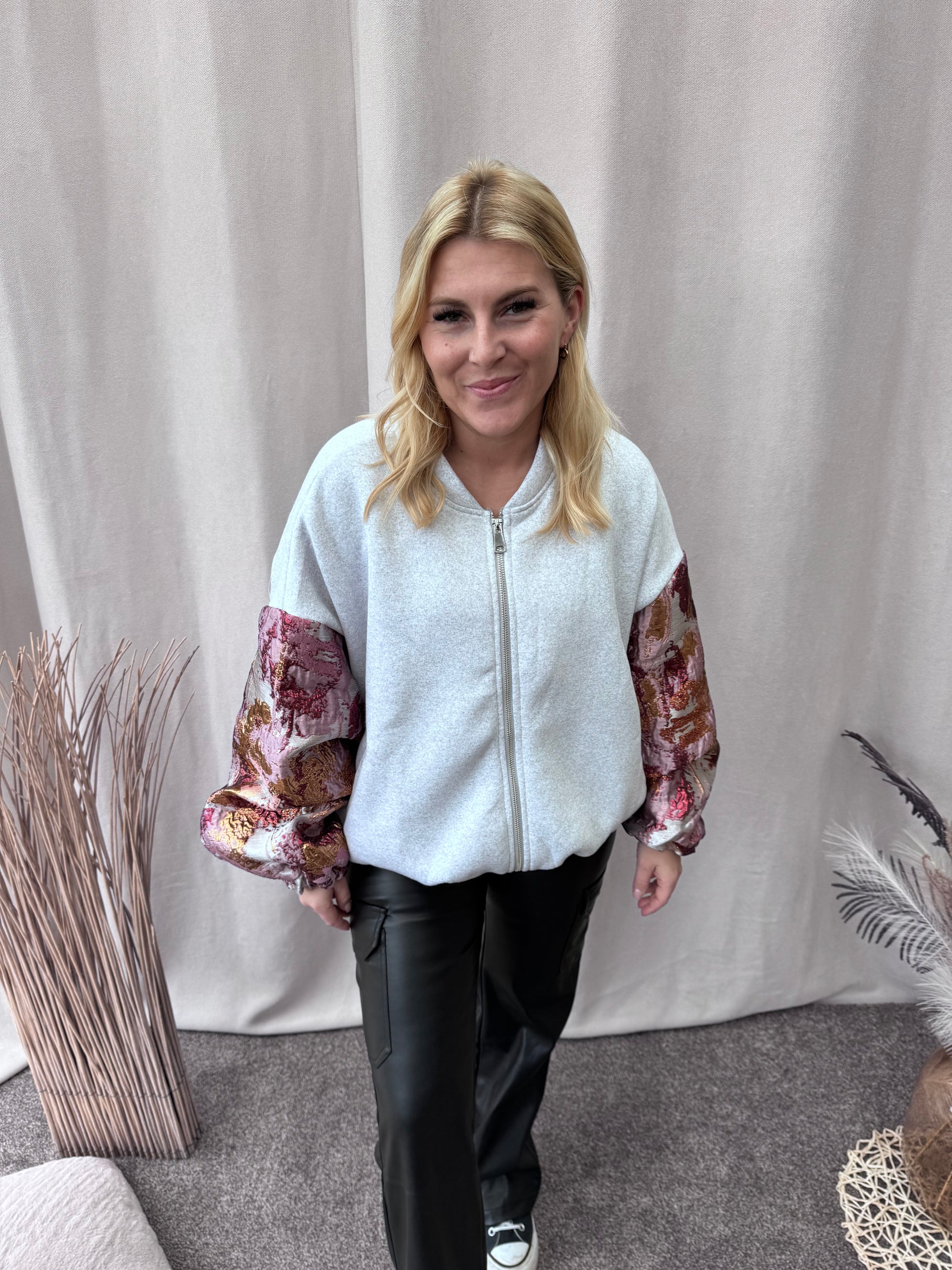 De bombervest heeft opvallende mouwen met verschillende roostinten en goud. De sluiting van de vest is een rits.