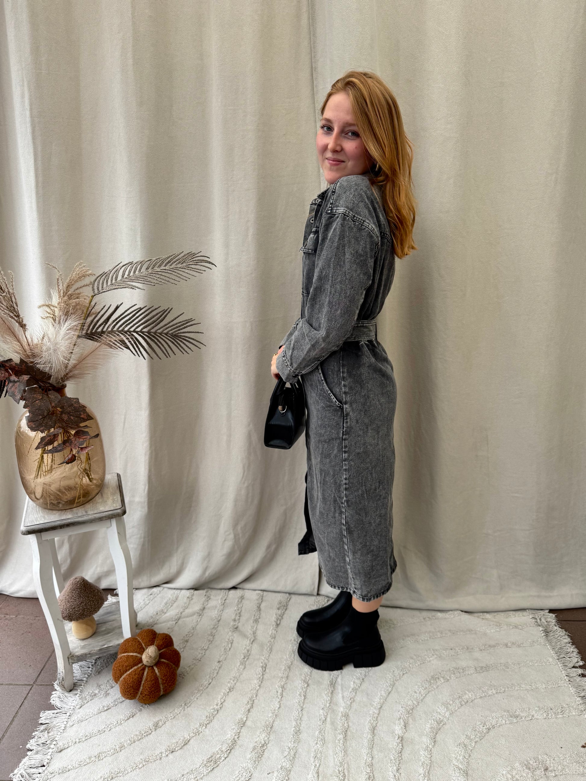 De missy dress is lang en aan de taille getailleerd. De riem is inbegrepen. De sluiting van de jurk is met knopen.