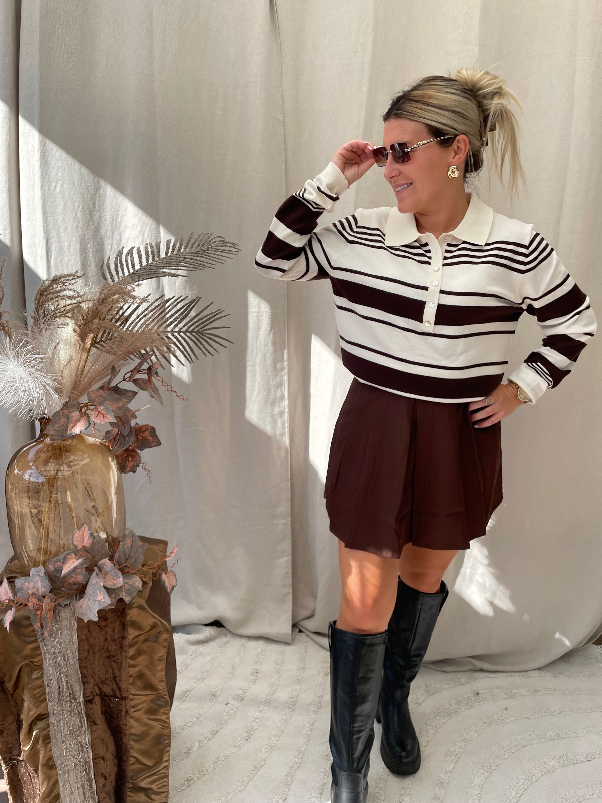 De rok heeft plooien en binnenin zit een short. De sluiting is achteraan met een rits.