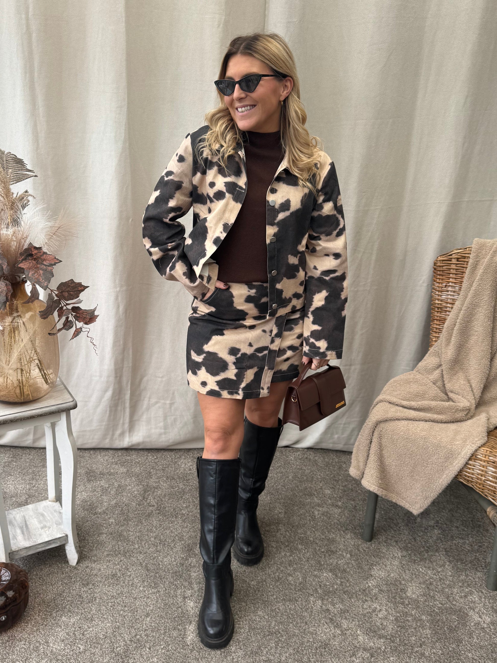 De rok is een jeansrok met cow-print. De sluiting van de rok is een rits en knopen.