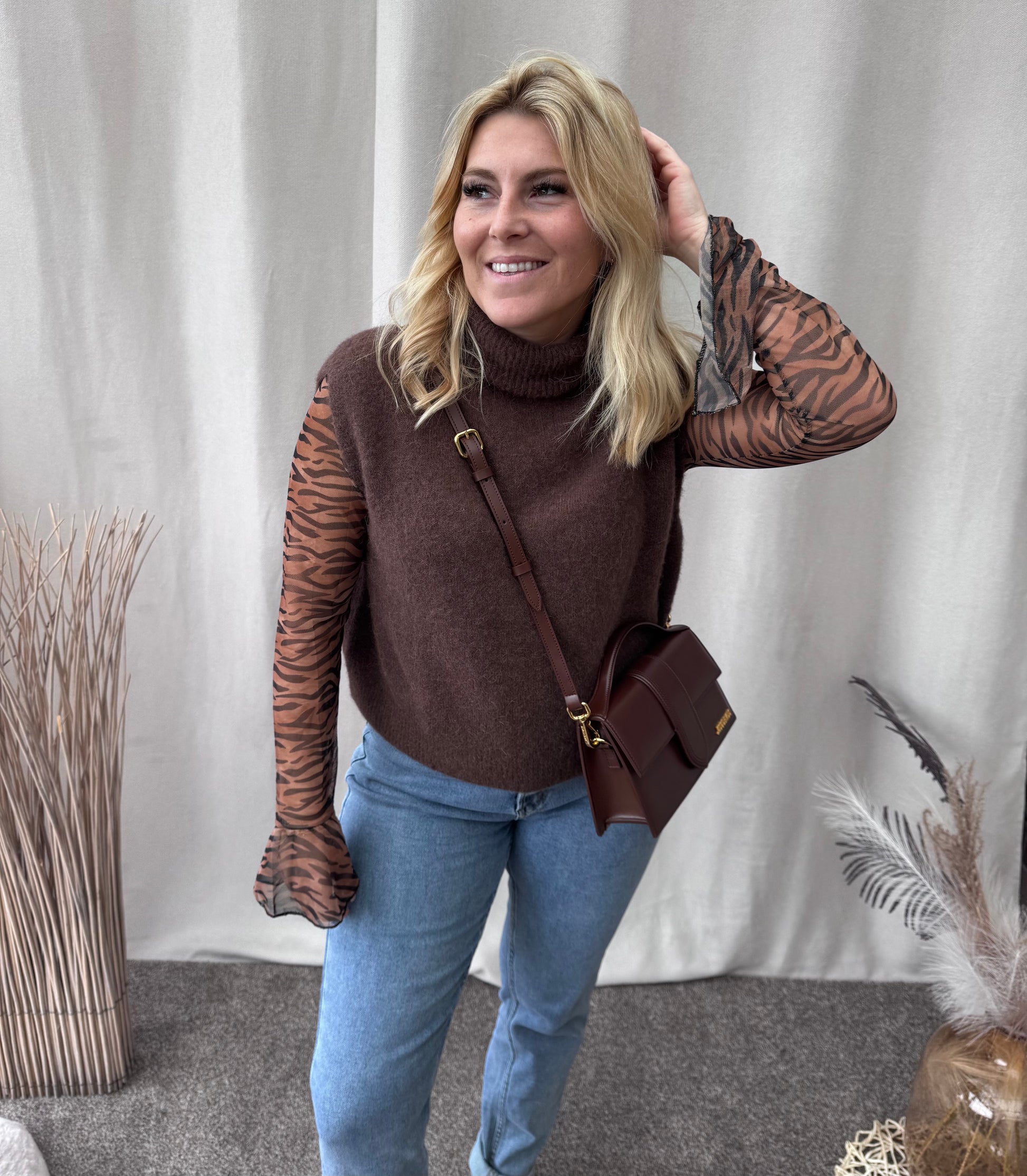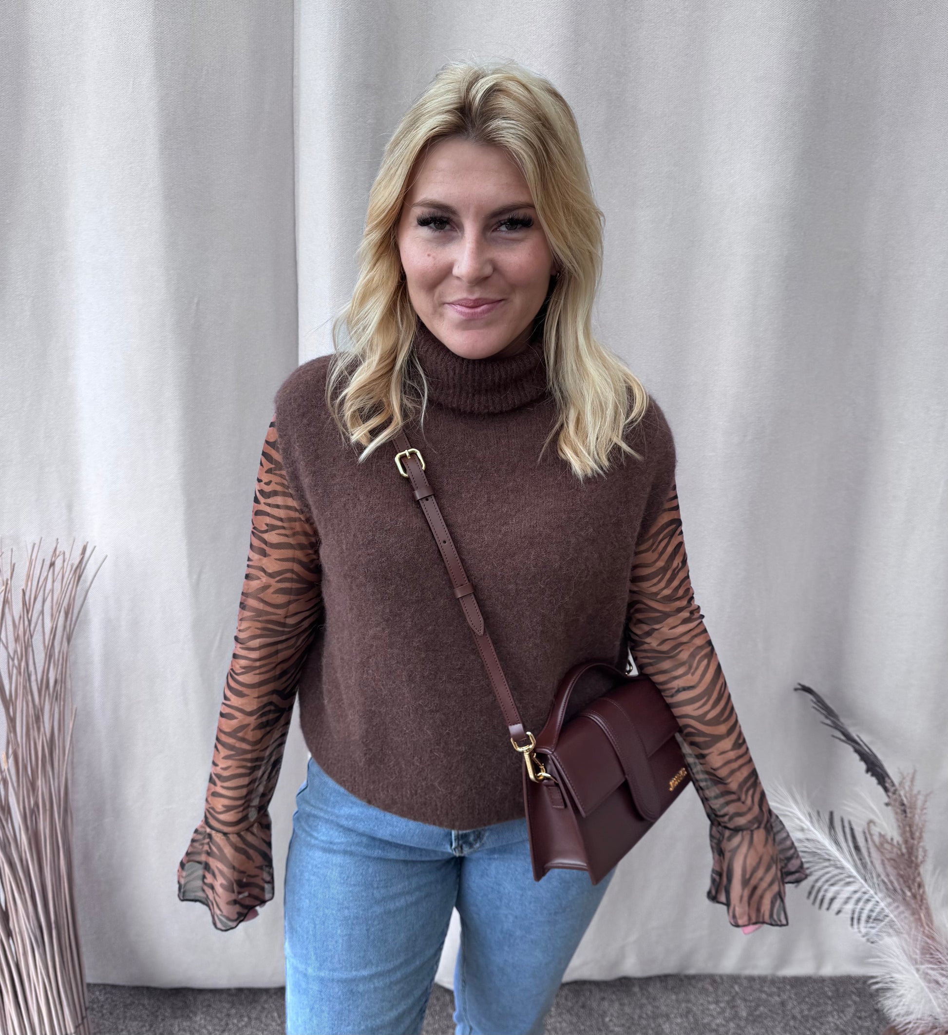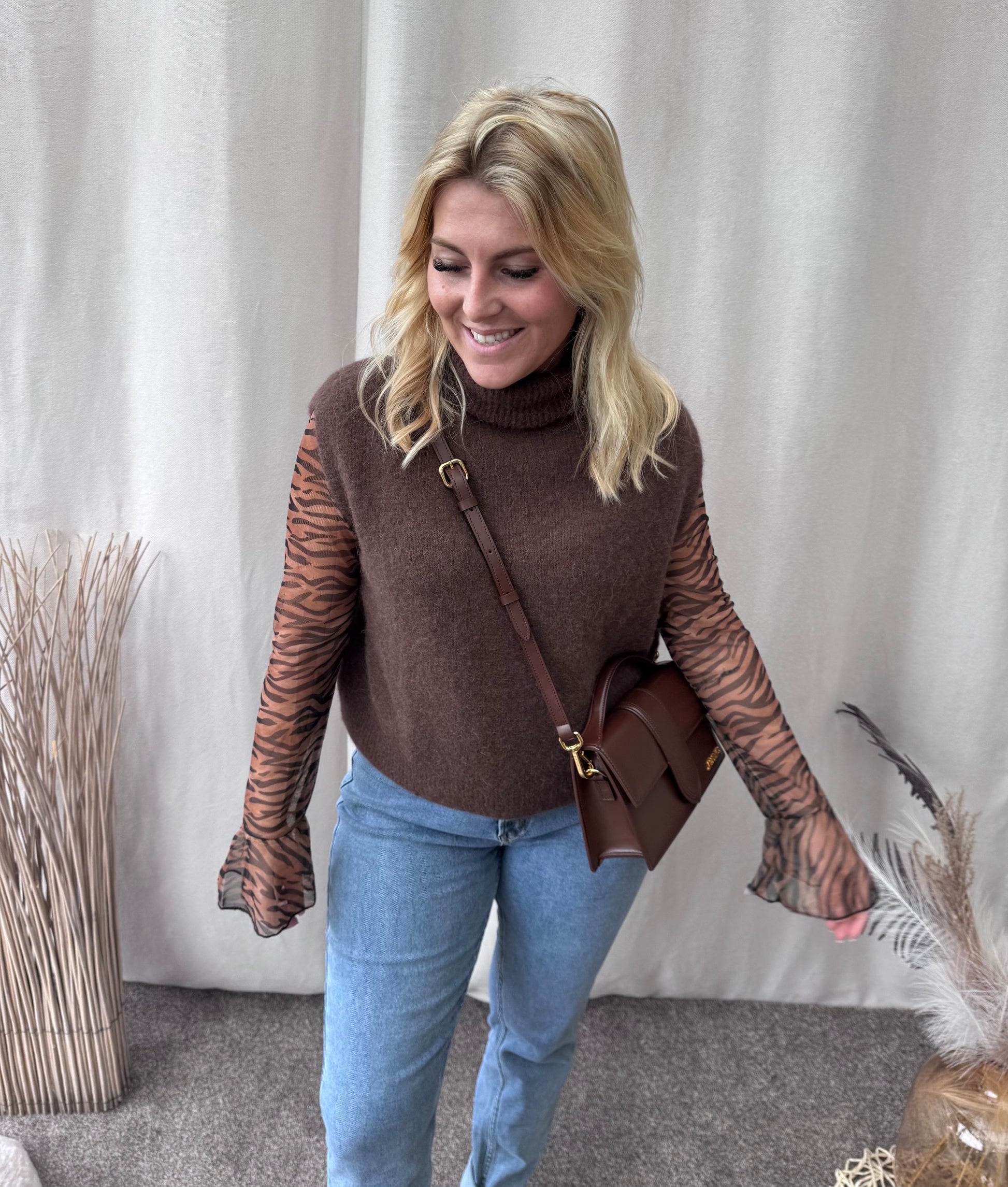 De shirt is see through en heeft uitlopende mouwen onderaan.