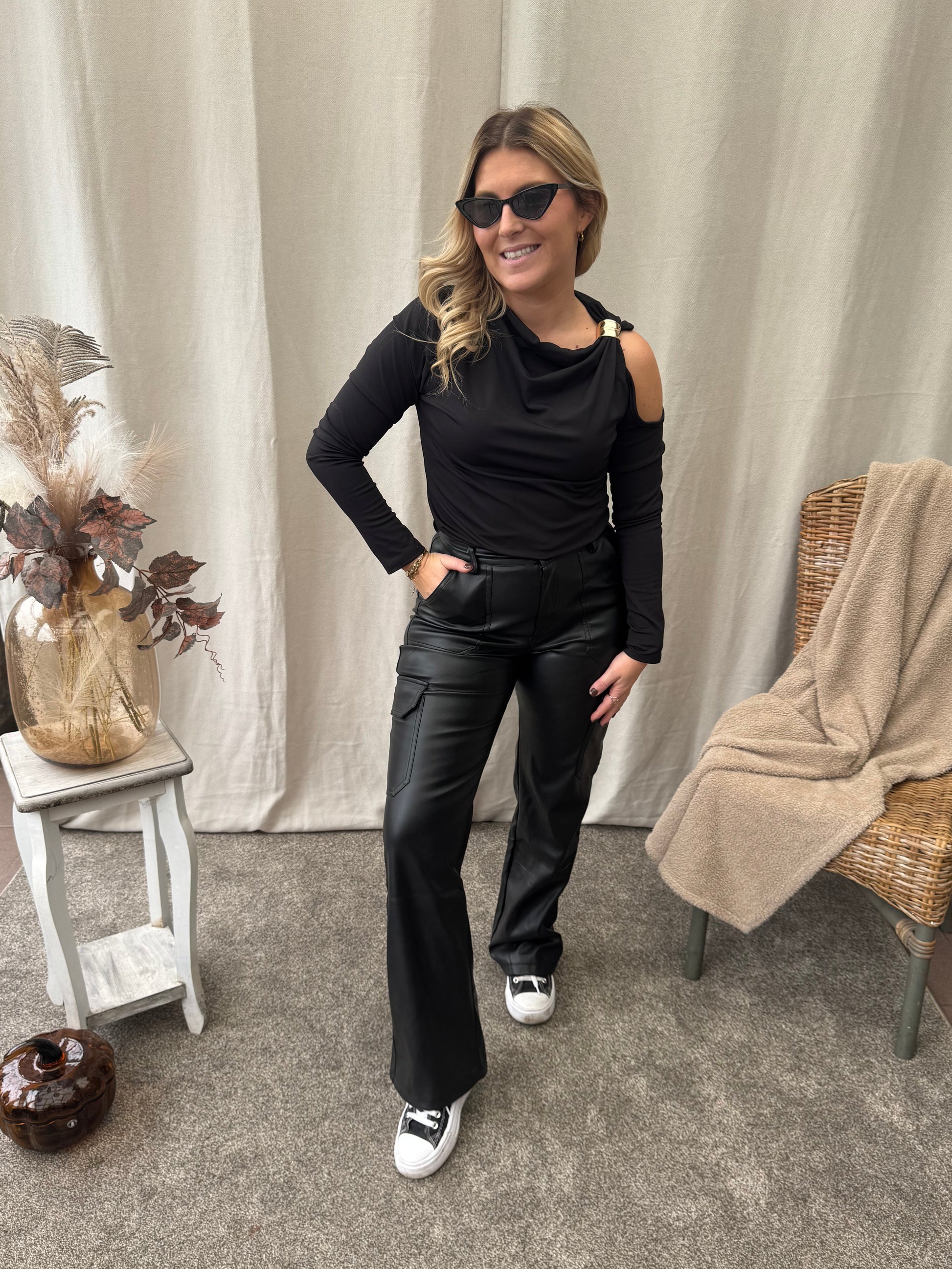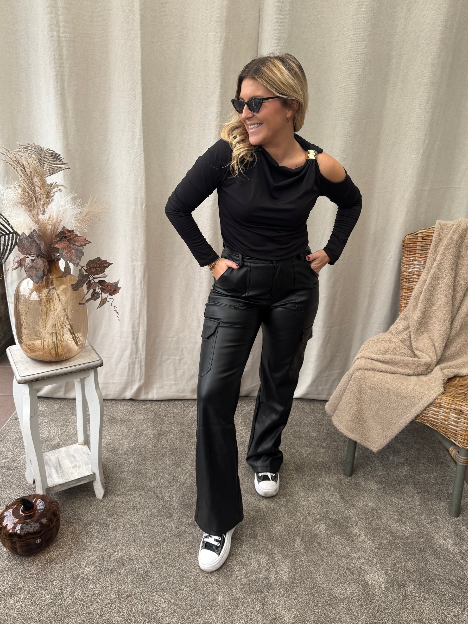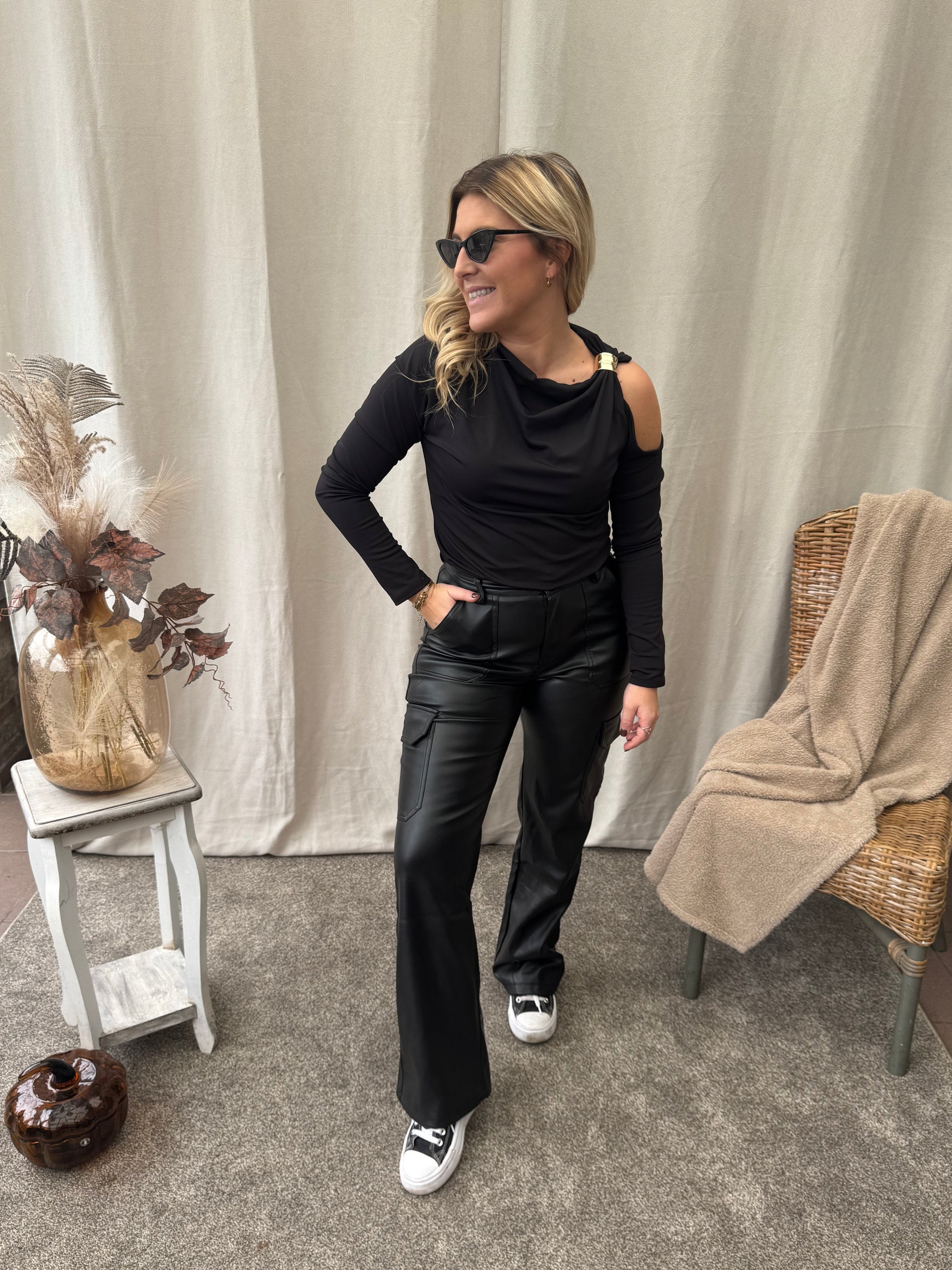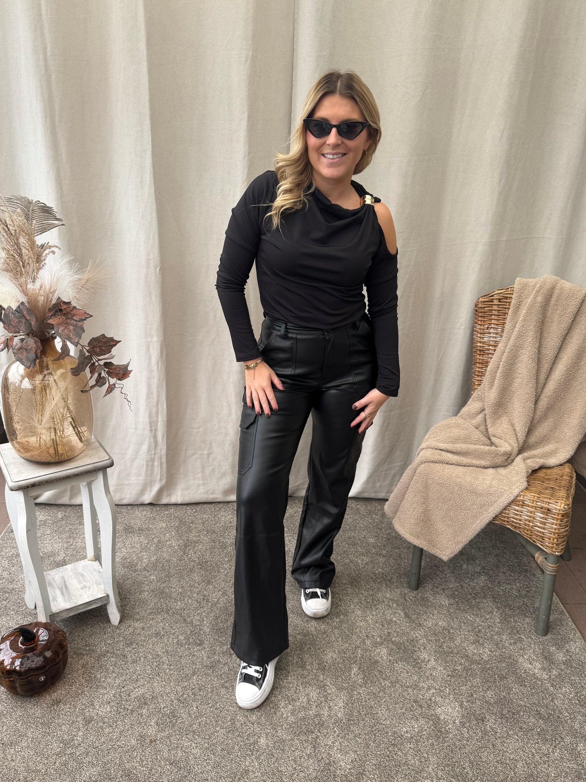 De longsleeve is assymetrisch en heeft een blote schouder.